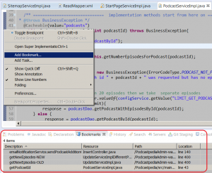 So I’ve found out where the method is used or where I want to modify some code. For sure I might want to go back to that location several times before I am finished. I don’t want to search for the location in code every time so I just bookmark it! How to do it – go to the left margin of the code view (where you set the breakpoints) > right click > Add bookmark…